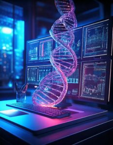 Firefly Un chromosome d’ADN sort d’écrans d’odinateurs qui affichent des statistiques. Les chromosom